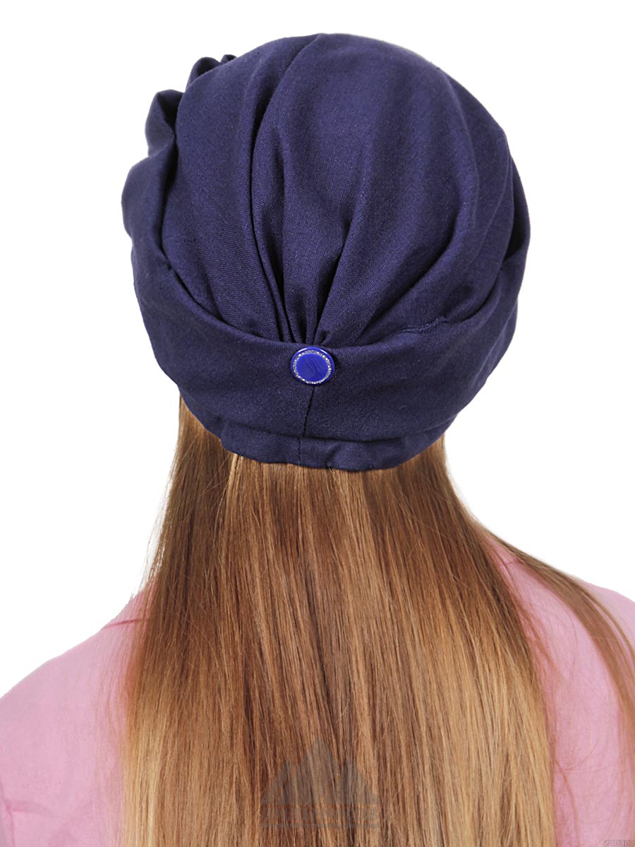 Кепка «Кэмерон» выполнена из льна. Модель имеет твердый козырек. По всей окружности ткань собрана в складки, а сбоку украшена крупными стразами. Сзади втачана резинка для фиксации головного убора.