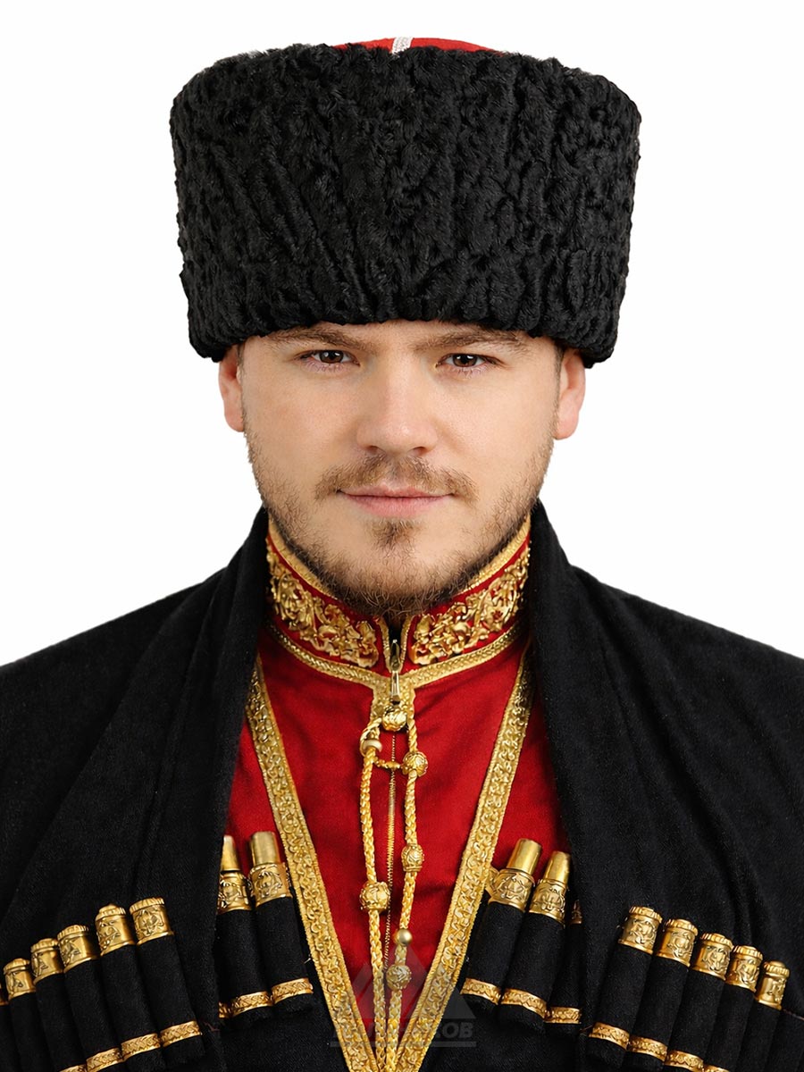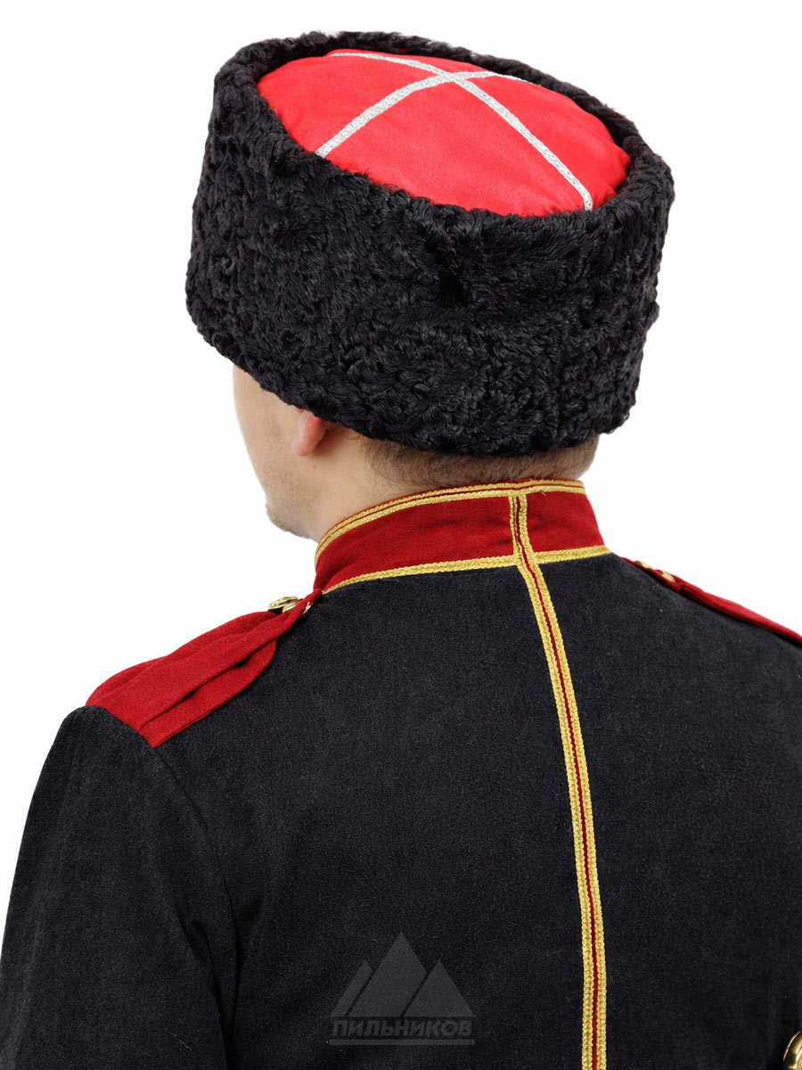 Зимняя мужская шапка-кубанка «Чапай» из натурального меха каракуля. Объемная модель прямой формы с коротким мехом, образующим на поверхности рельефный рисунок, с верхом из габардина прошитым галуном золотого или серебряного цвета в зависимости от цвета донца. Шапка очень теплая, потому что собрана из нескольких слоев подкладочного материала. В разобранном виде может служить некой емкостью, при необходимости. В подкладке из стеганой саржи имеется скрытый шнурок, который позволяет регулировать размер головного убора. Кубанка «Чапай» выглядит роскошно, исполнена очень аккуратно и качественно.