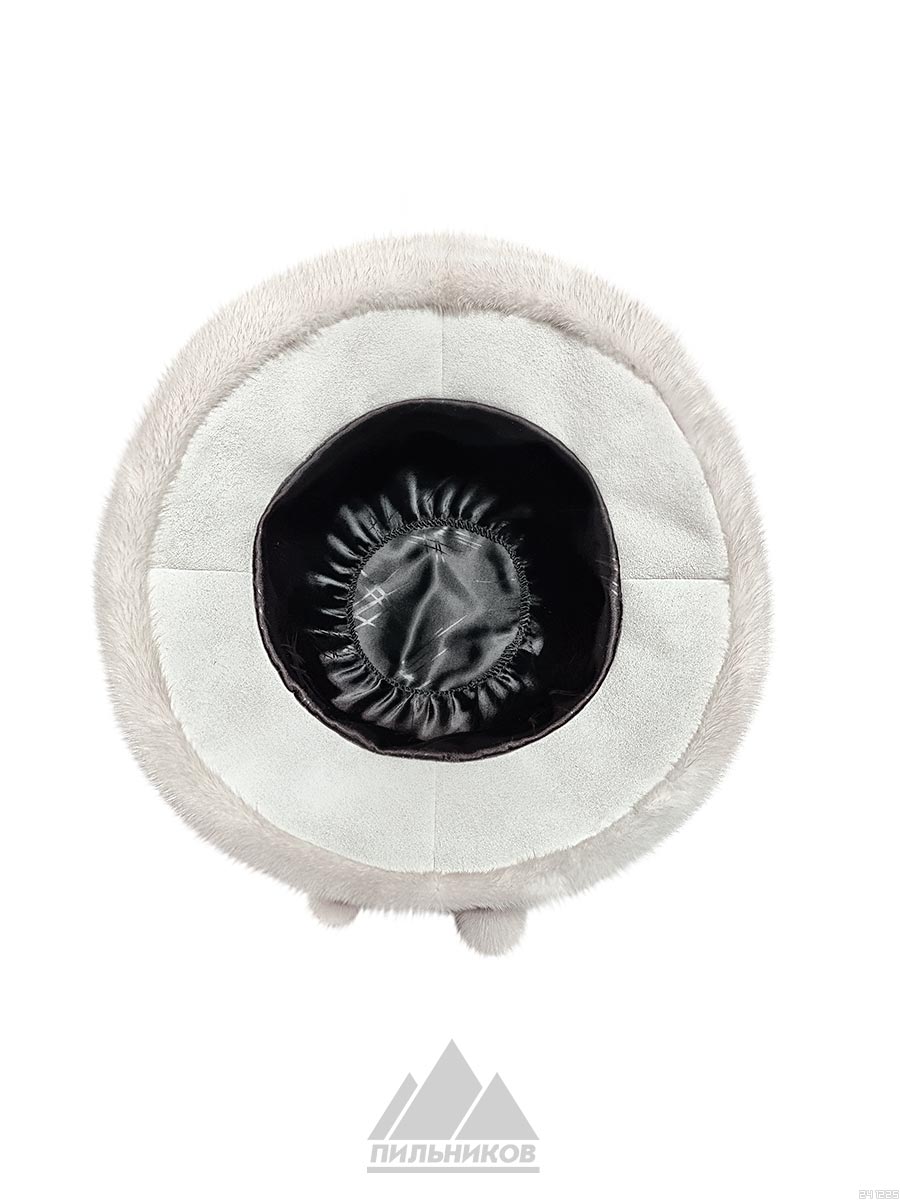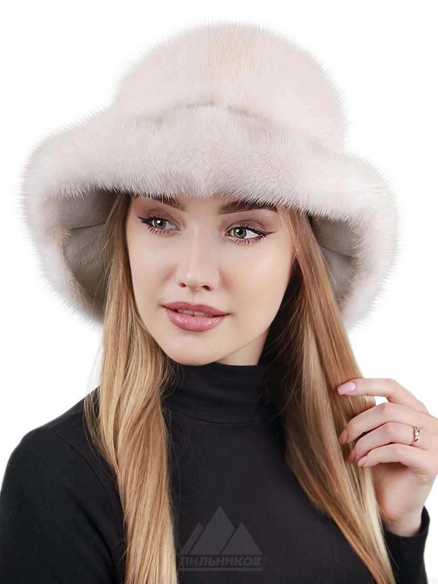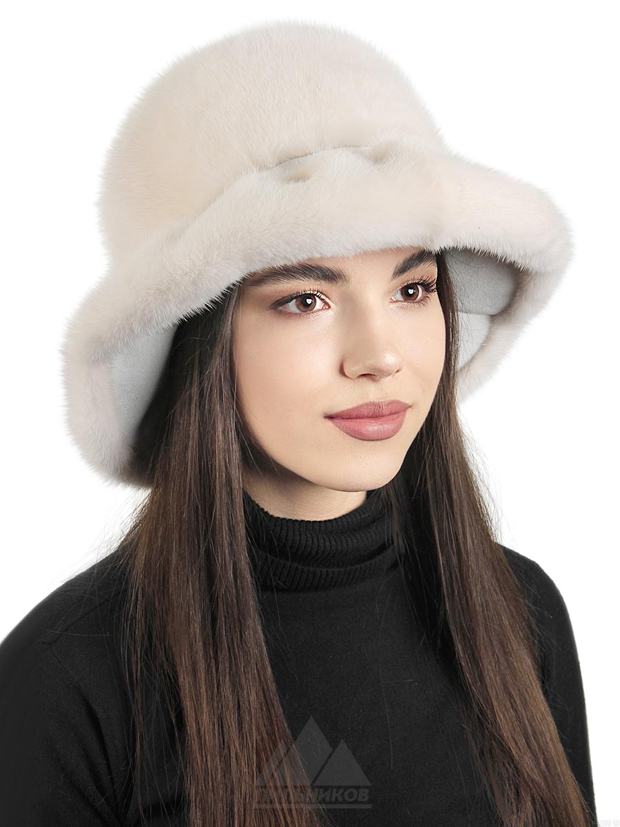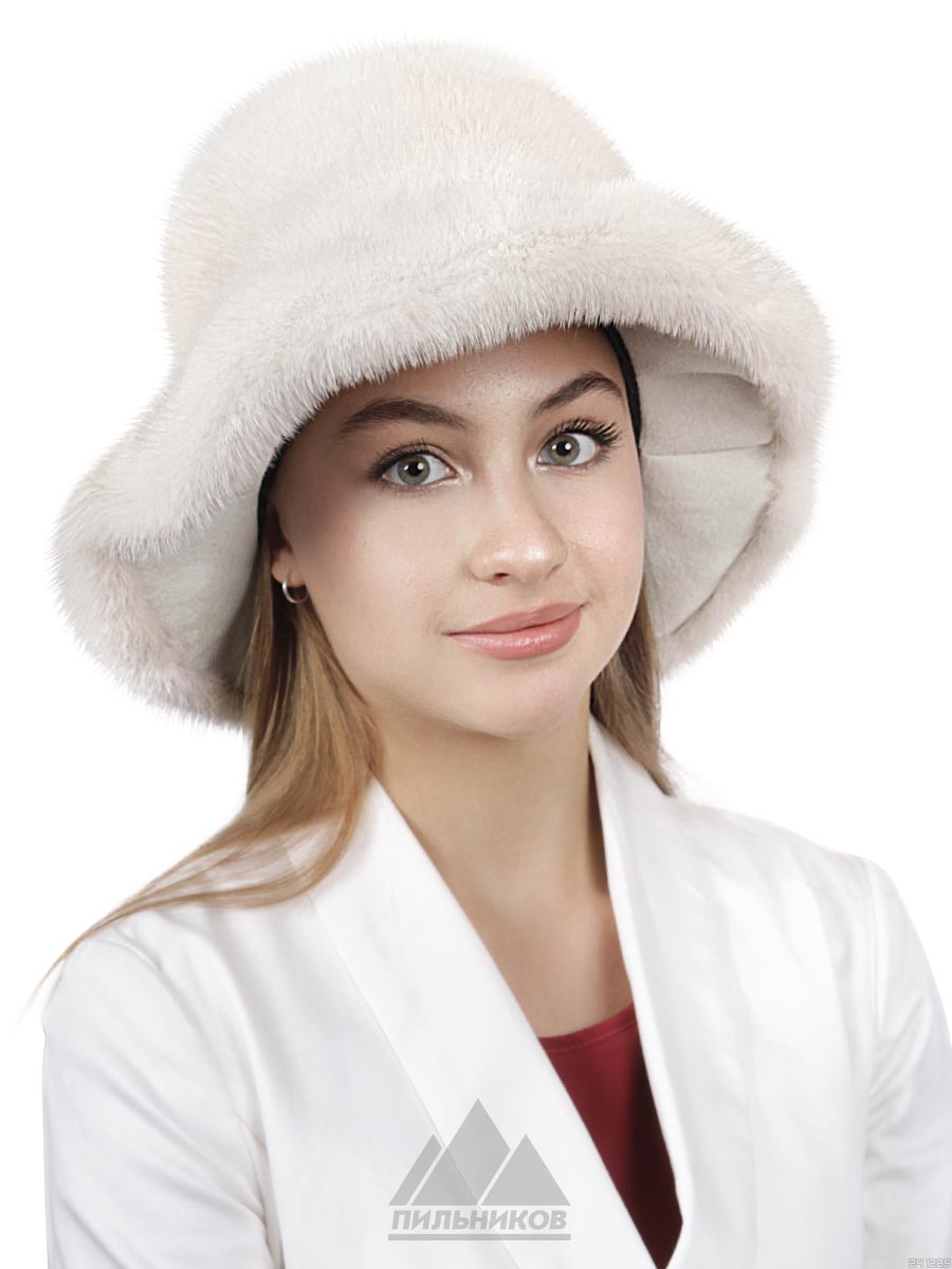 Шляпа «Армель» выполнена из натурального меха норки. Эксклюзивная модель с круглой тульей и широкими волнообразными полями. Размер полей: 6 см. Сзади шляпка украшена декоративным бантом из той же норки. Внутри подкладка из саржи.