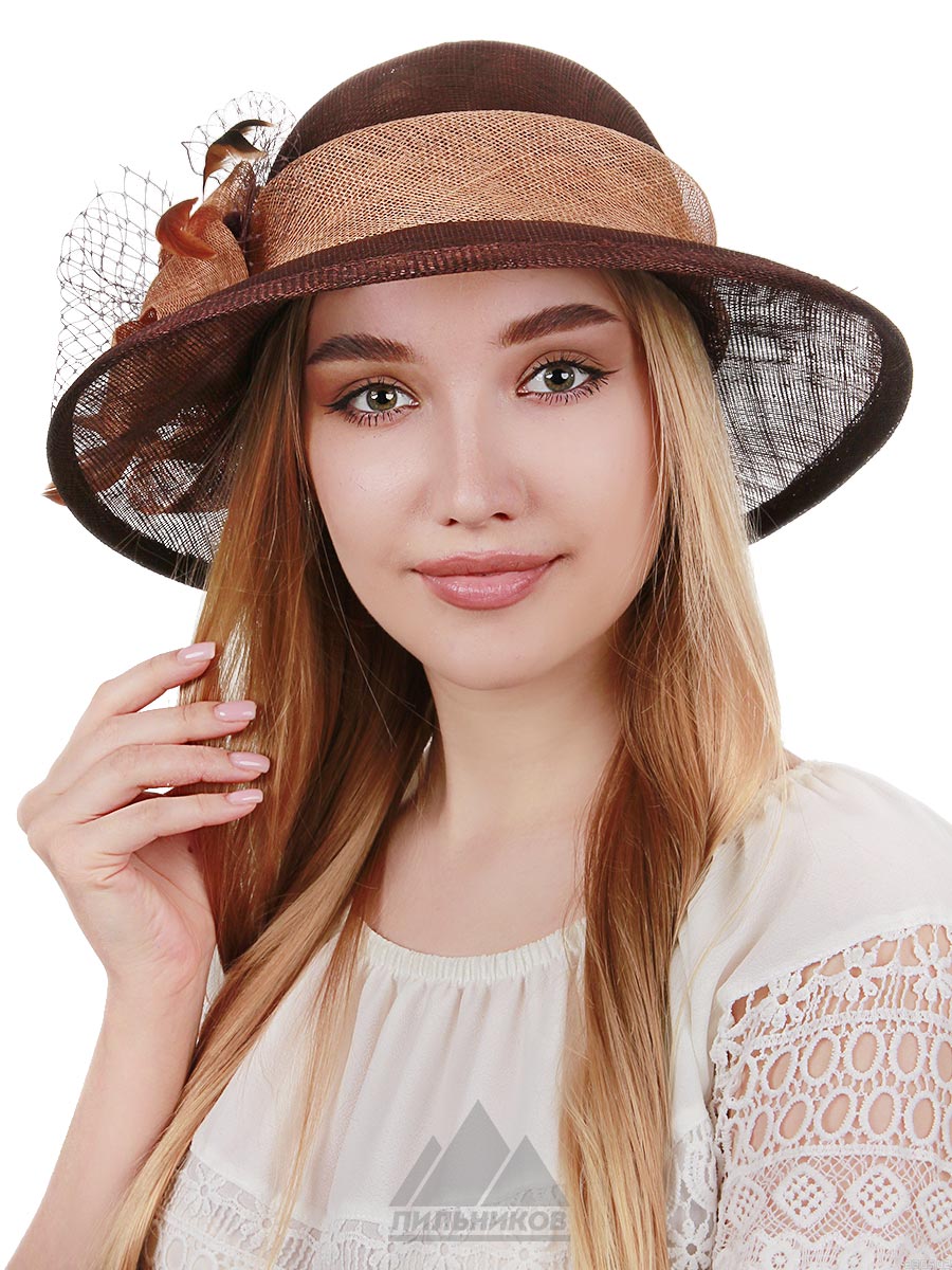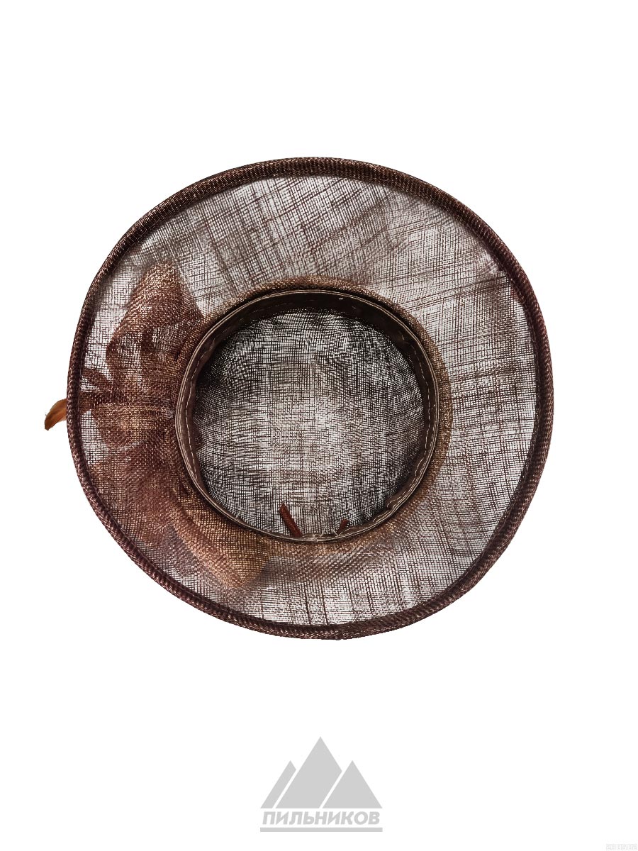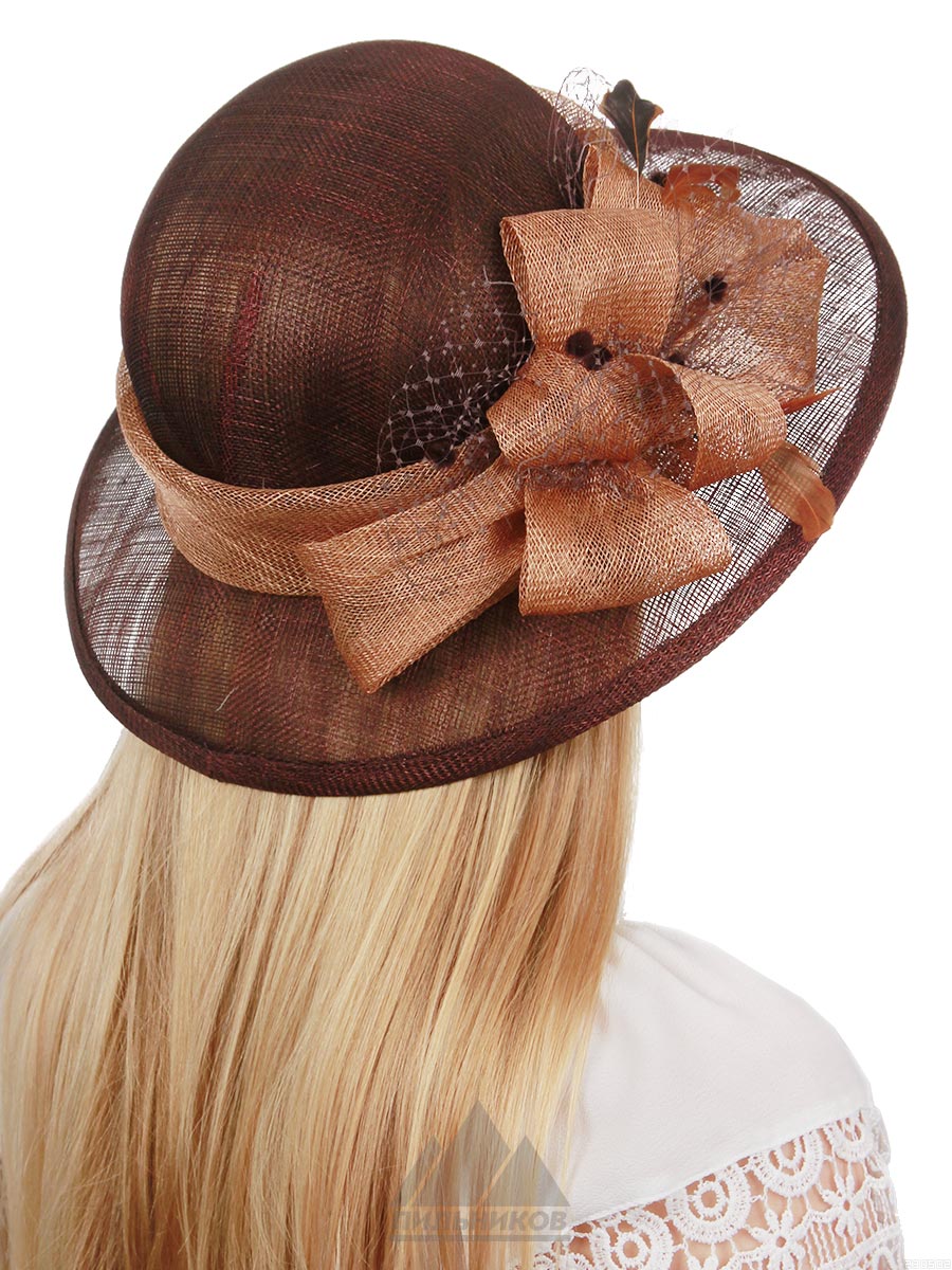 Шляпа «Габриэлла» выполнена из легкой соломки синамей, изготовленная из листьев филиппинской банановой пальмы. Оригинальная модель с высокой закругленной тульей и прямым симметричным полем средней ширины. Сбоку расположено объемное украшение в виде банта из того же материала, дополненное вуалью. Головной убор без подкладки, удобную посадку обеспечивает внутренний регулятор размера.