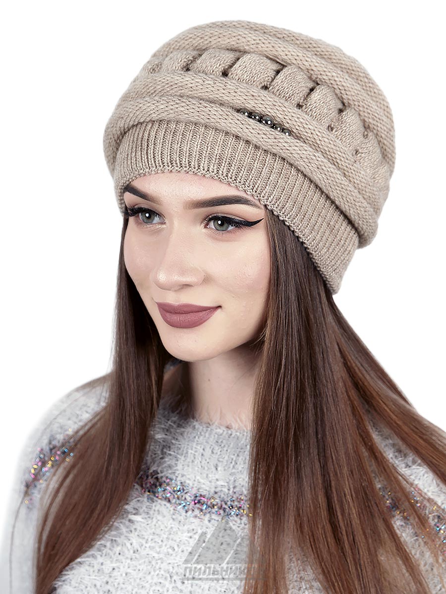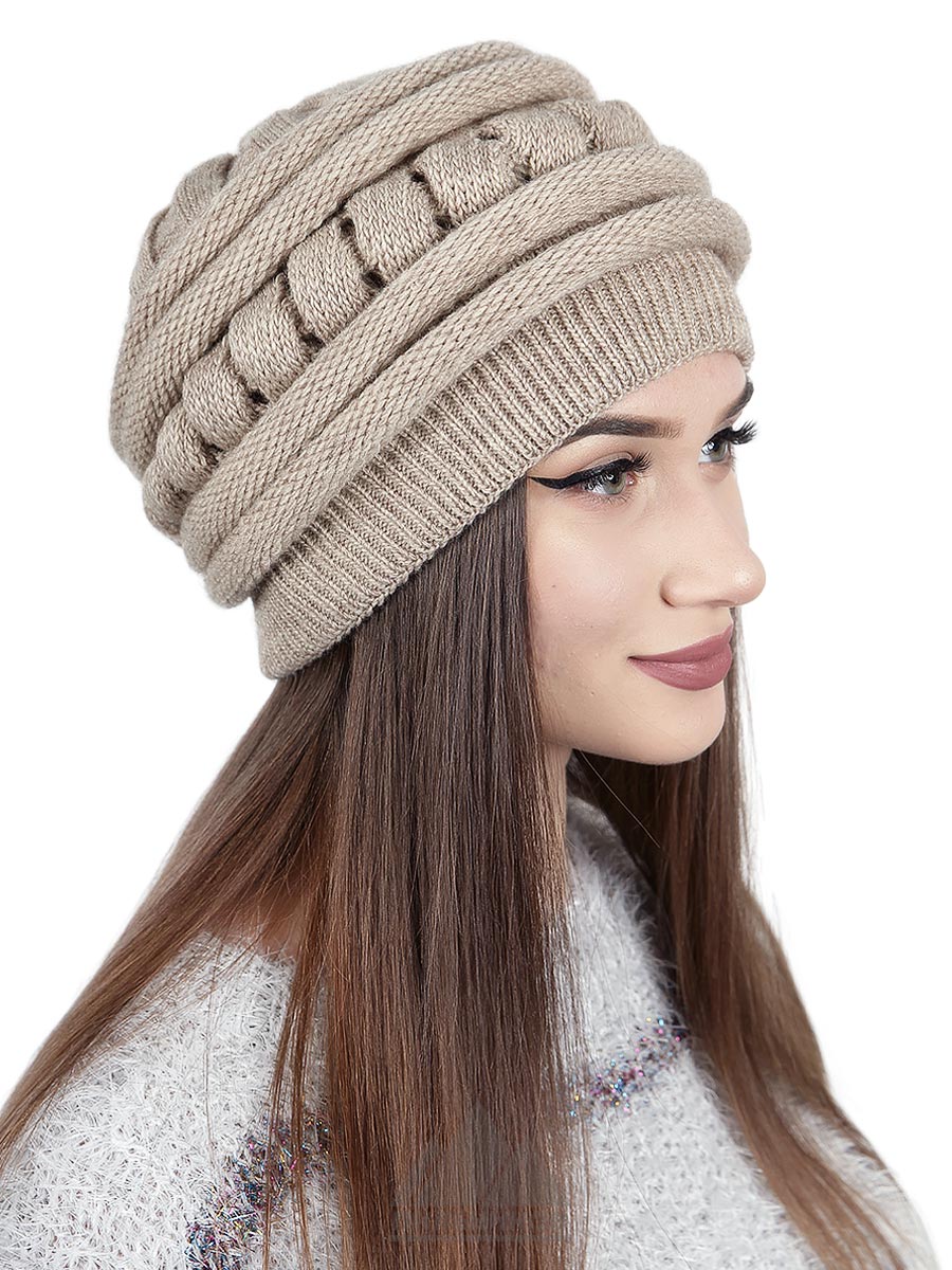 Шапка «Триша» - это женский головной убор из трикотажа крупной вязки. Состав трикотажа: шерсть 50%, акрил 50%. Мягкую форму шапки образуют задрапированные складки, создающие объем. Подкладки нет. Изделие имеет глубокую посадку, поэтому прекрасно сидит на голове.