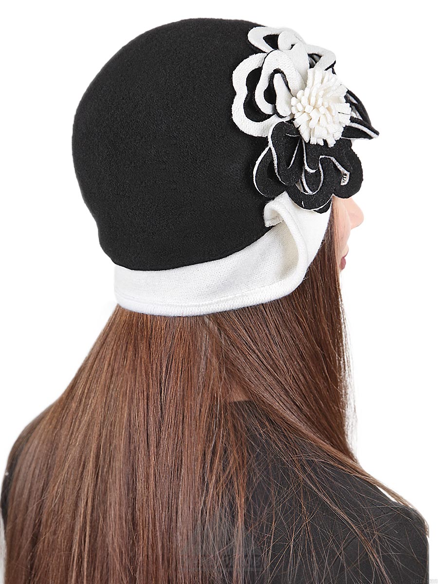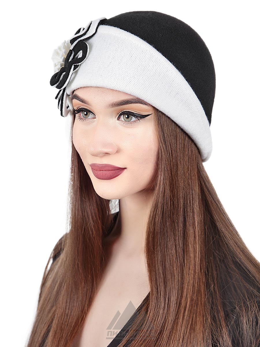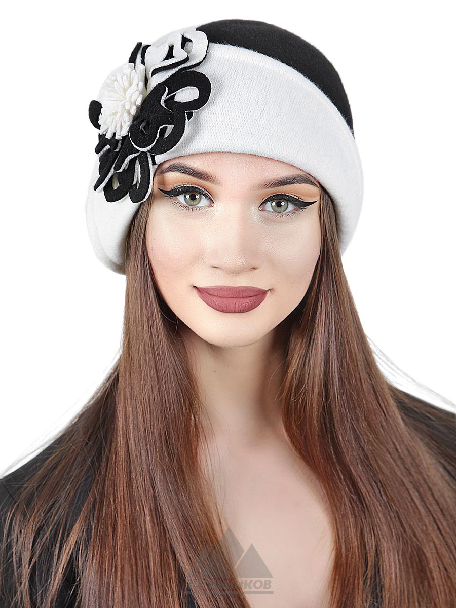 Шляпа «Медина» изготовлен из кашемира. Мягкая модель без подкладки с небольшим полем, загнутым спереди вверх. Шляпа украшена большим цветком сбоку. Регулятор размера отсутствует.