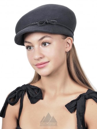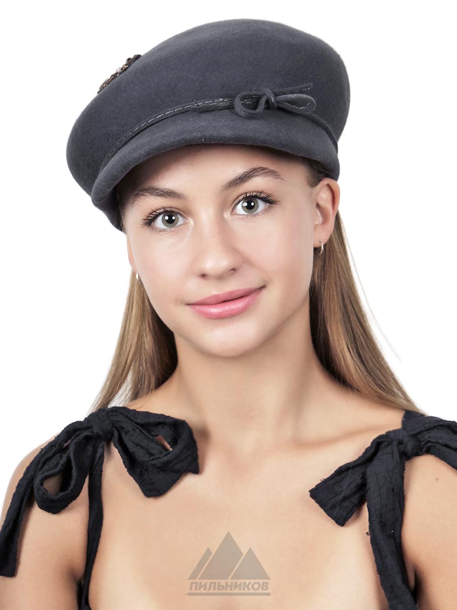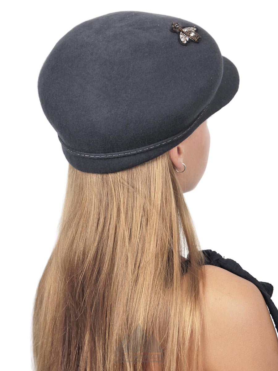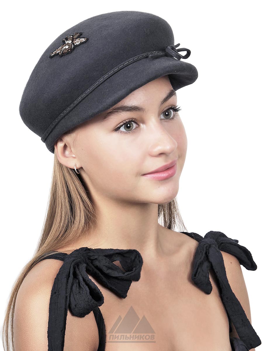 Кепка «Эвелина» - женский головной убор из натурального фетра. Объемная модель с асимметричной тульей и небольшим козырьком. Внутри подкладка из саржевой ткани. Кепка сбоку украшена оригинальной брошью. Регулятор размера не нужен, в качестве стабилизатора размера есть трикотажный клапан.