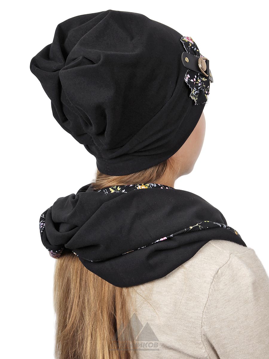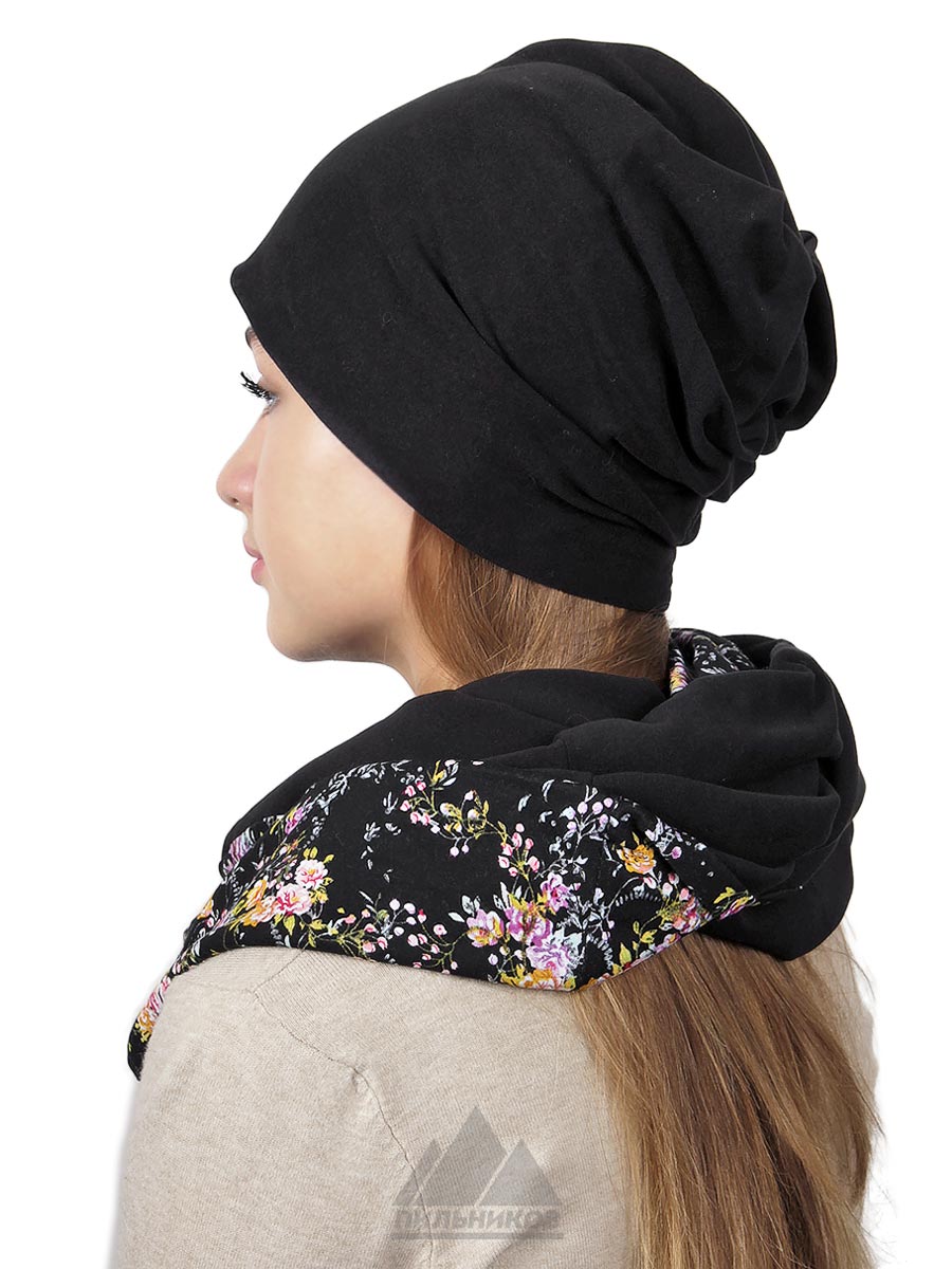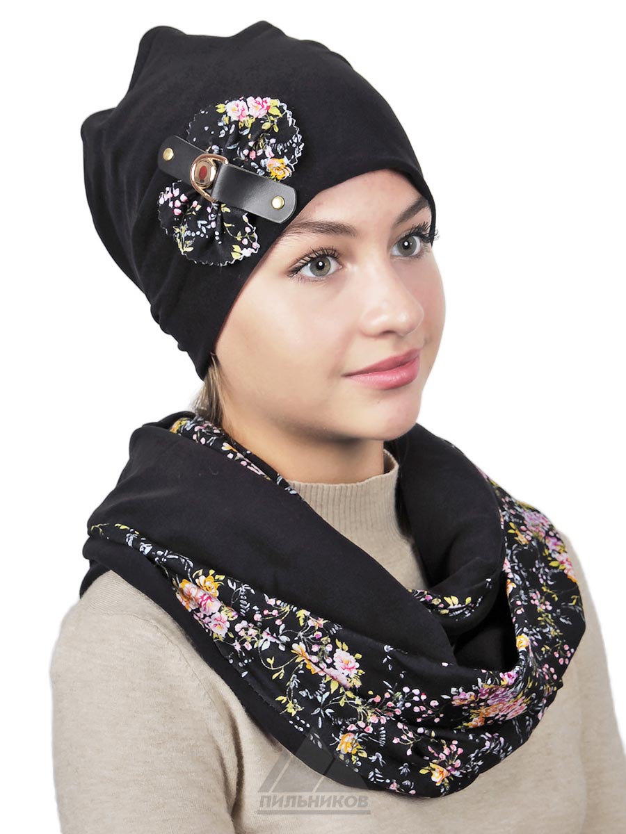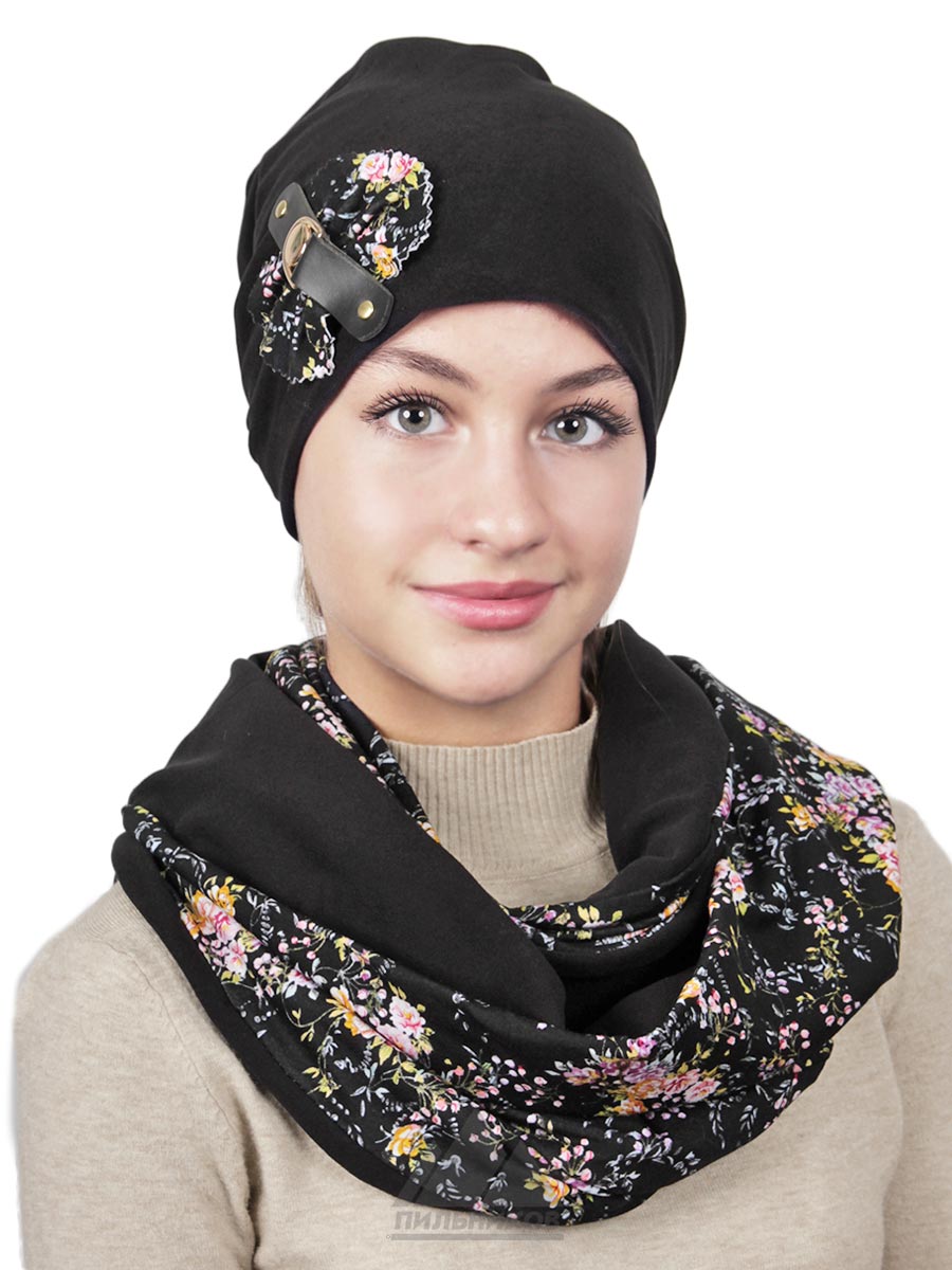 Комплект «Шарлотта» - изготовлен из текстиля. В комплект входят шапочка и шарф-снуд. Шапочка без подкладки облегающей формы, сбоку украшение в виде банта с пряжкой. Шарф связан в кольцо из того же материала с цветочным принтом.
