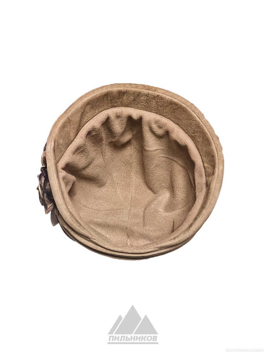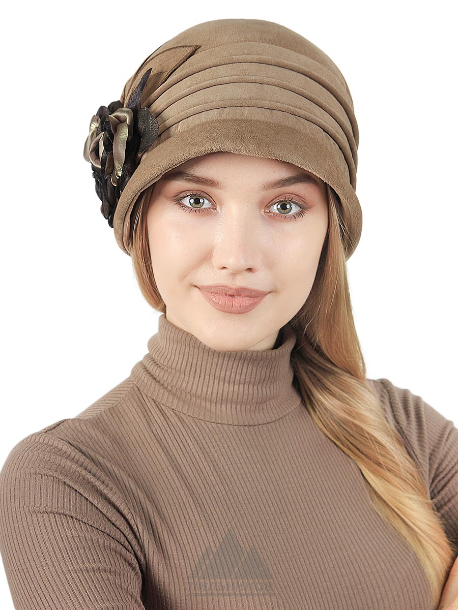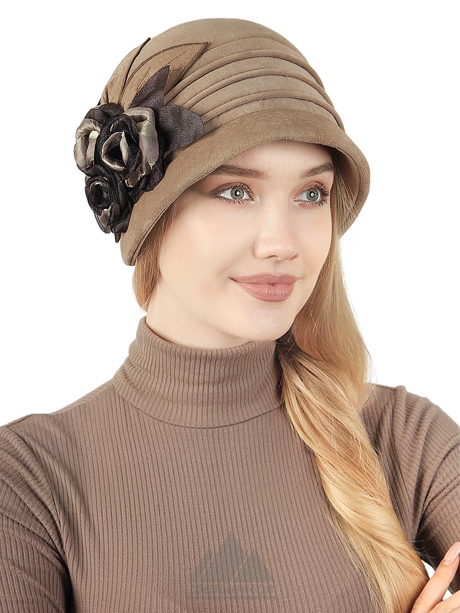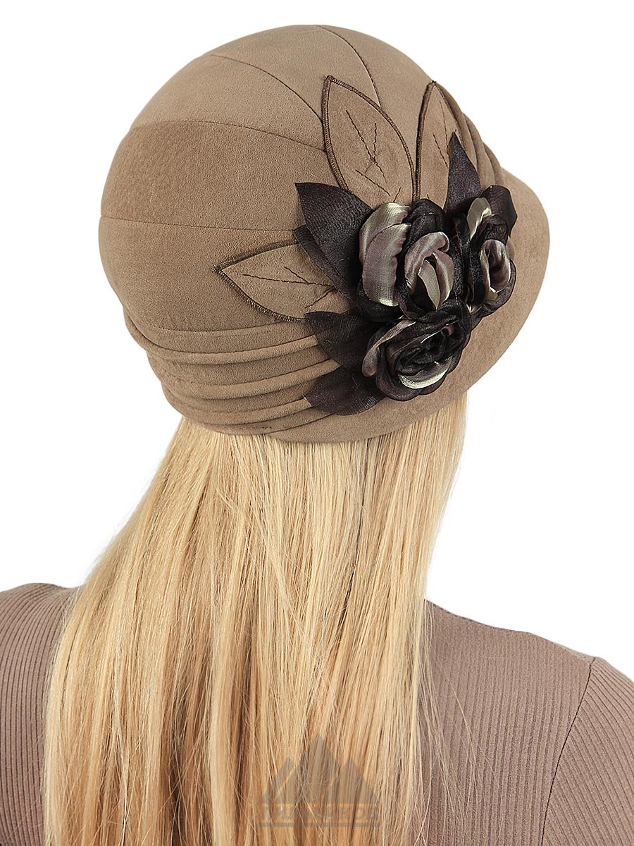 Модная шляпка «Адамина» - головной убор авторской работы из натуральной замши. Тулья оформлена складками, сбоку расположена аппликация в виде роз с листьями. Модель с небольшими прямыми полями, сшита поперечными клиньями. Подкладкой может служить флис или искусственный мех. Регулятора нет.