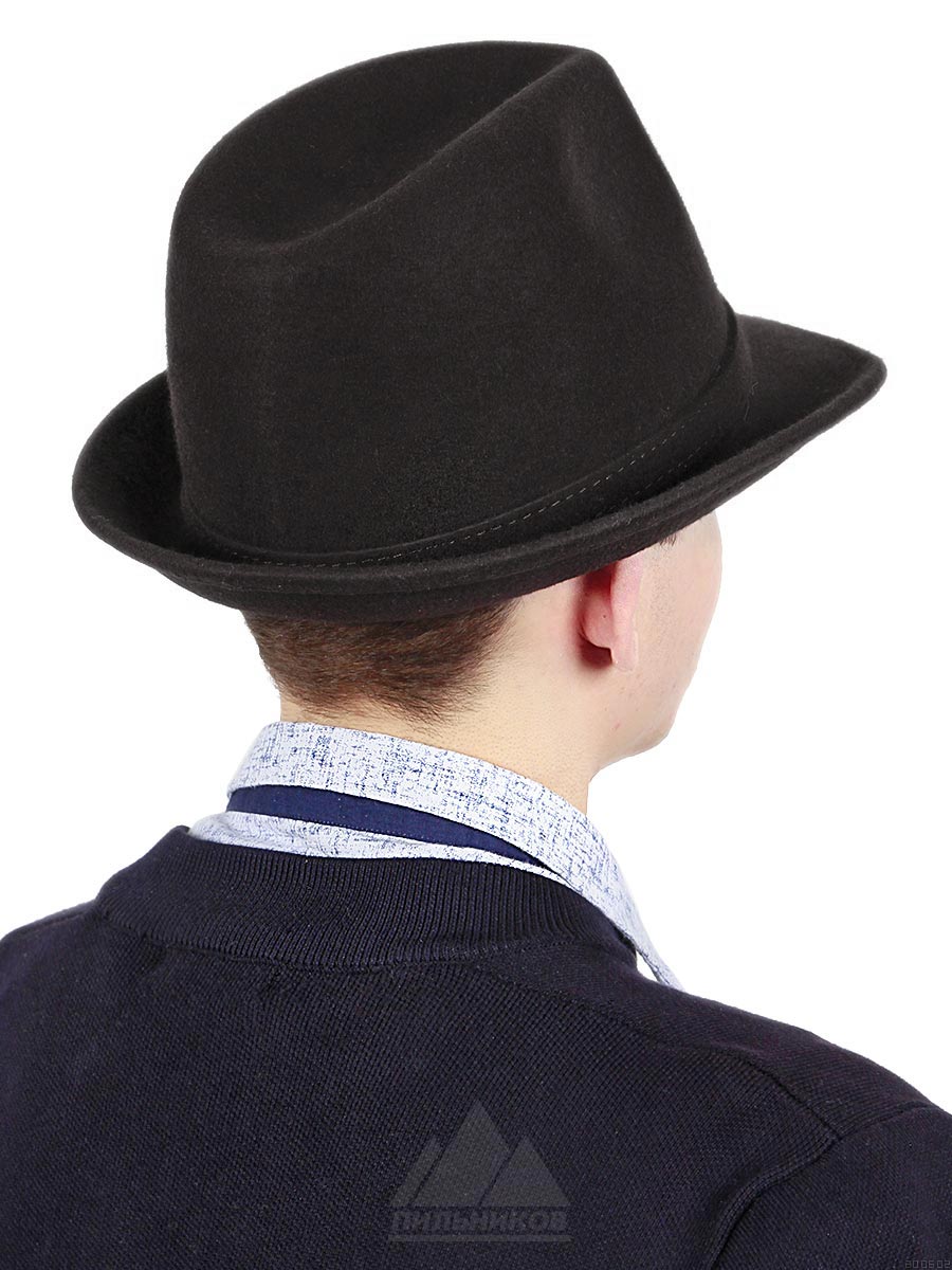 Шляпа «Фрэнк » - мужской головной убор из натурального шерстяного фетра. Модель классической формы с конусообразной тульей и оригинальным загнутым сзади узким полем. Основание тульи по всей окружности украшено тонким ремешком из той же фетровой ткани. Внутри подкладка из саржевой ткани.