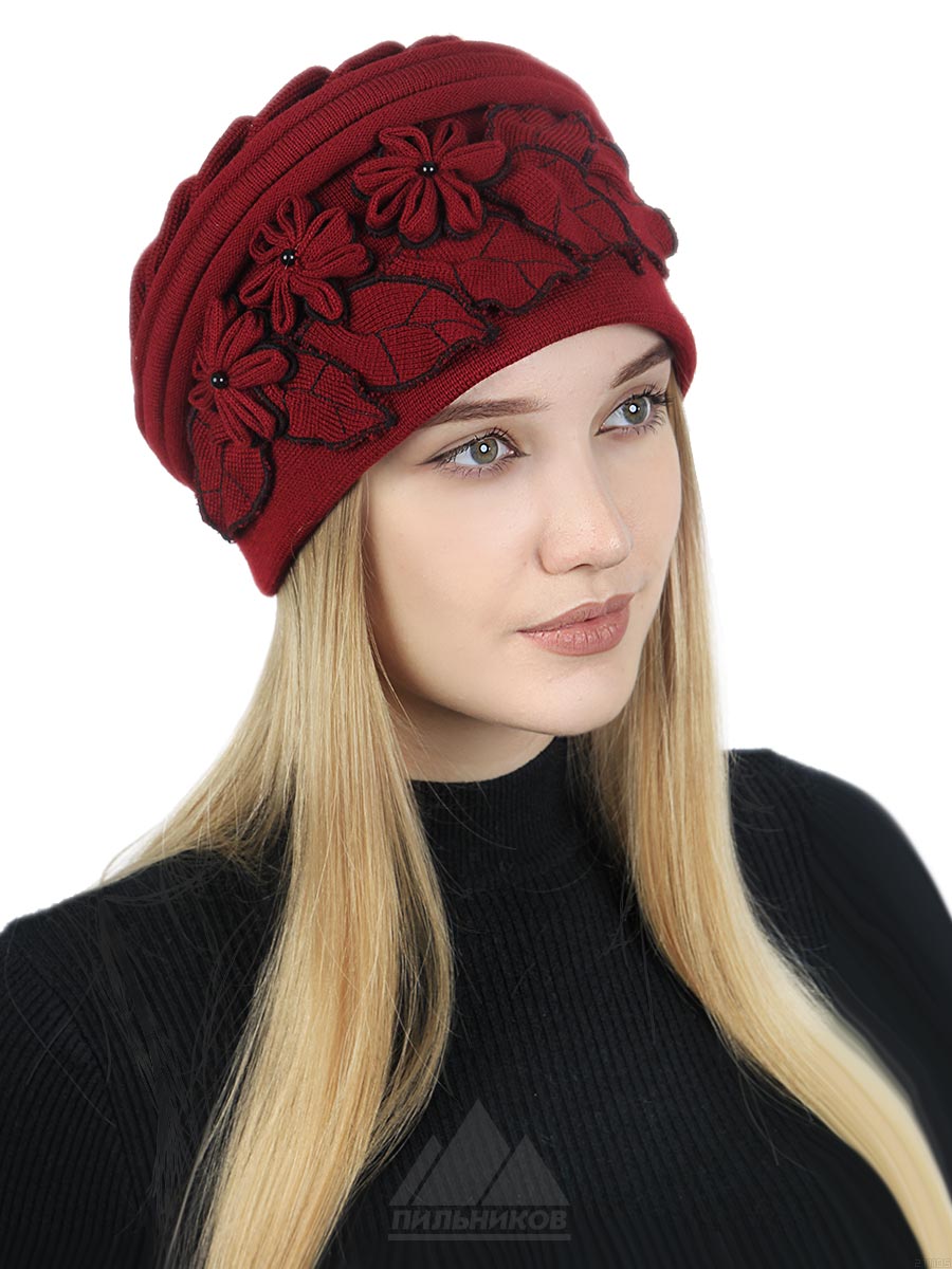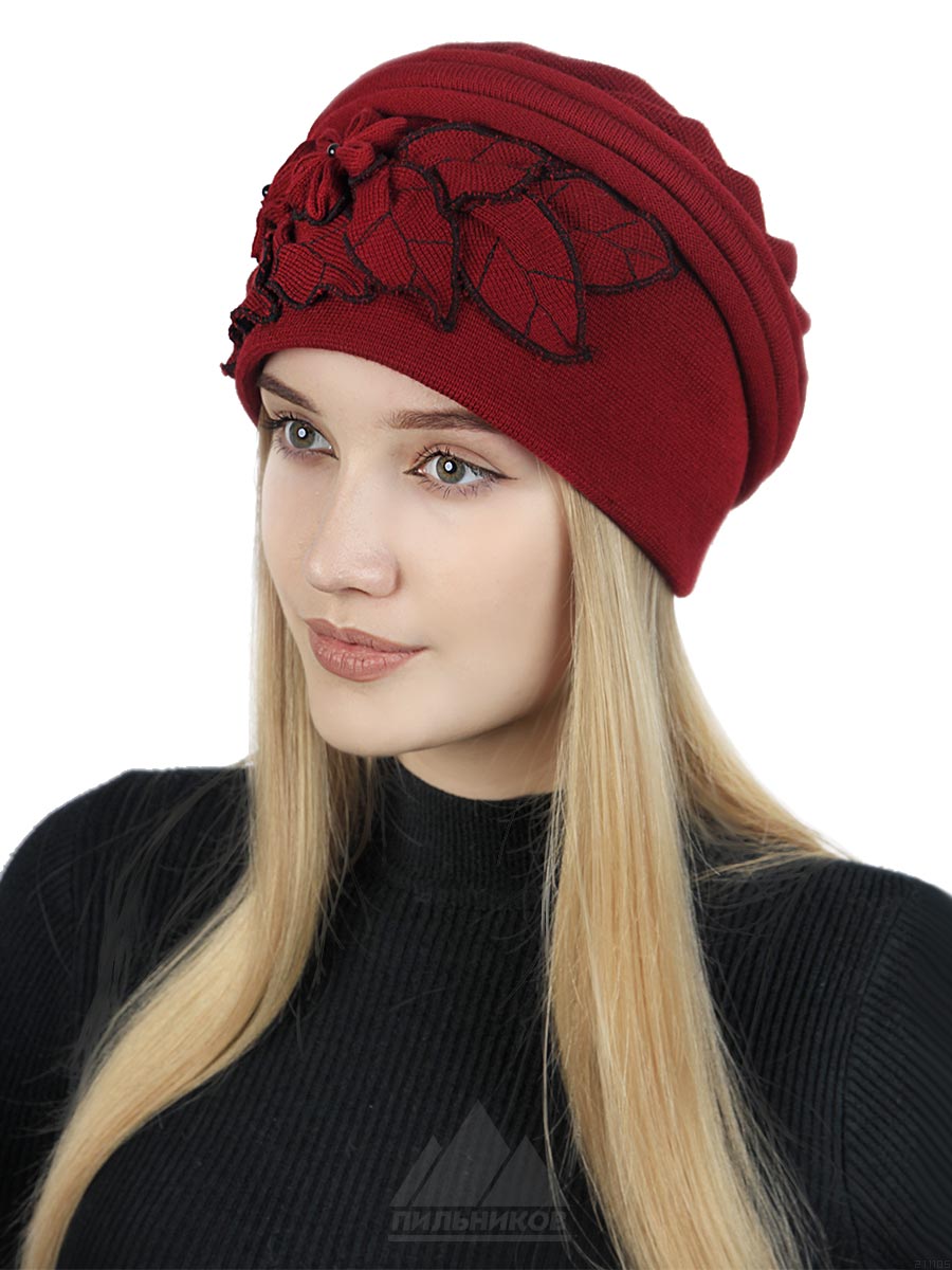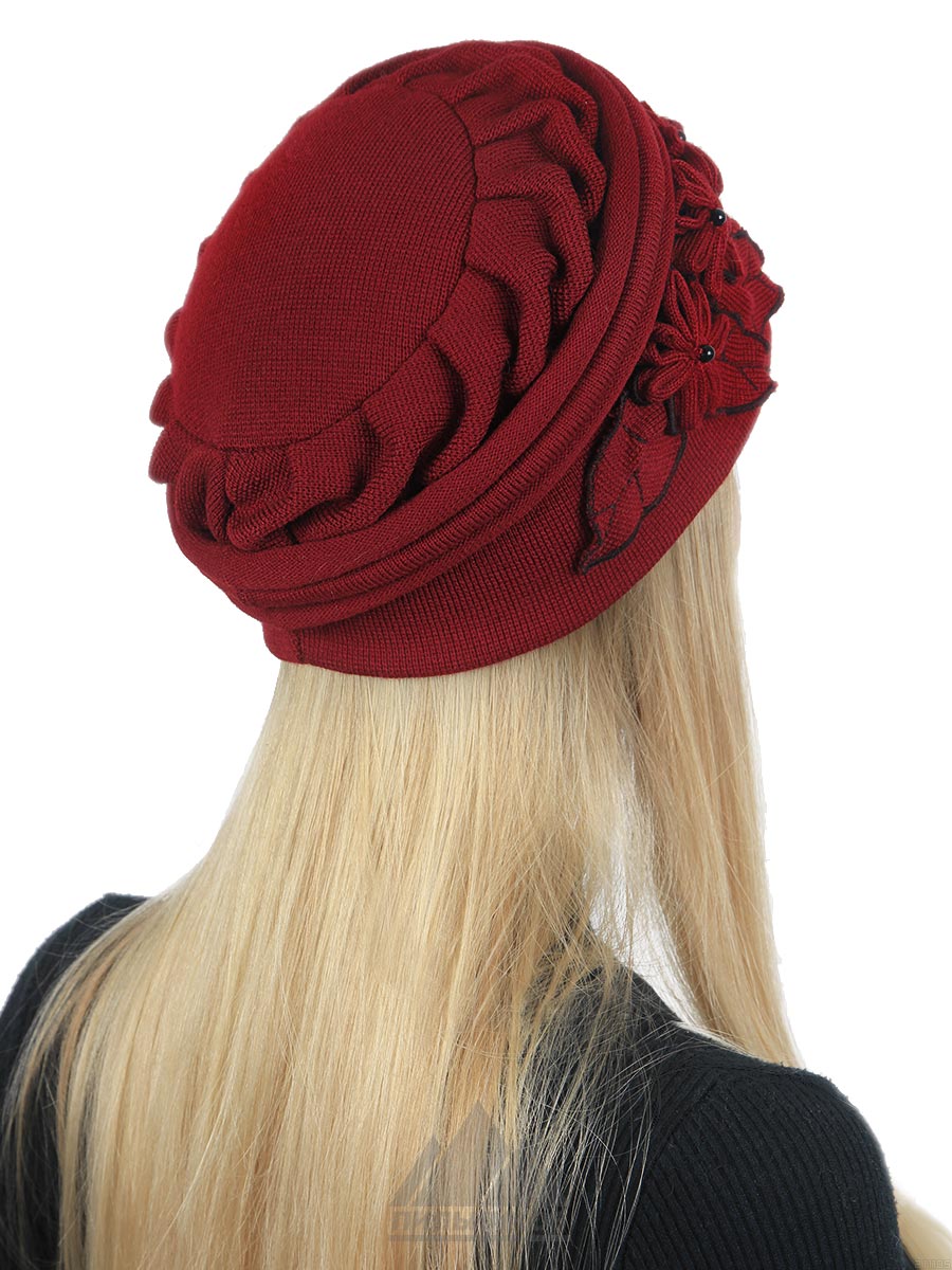 Шапка «Жасмин» - мягкий женский головной убор из трикотажа. Уникальная модель авторской работы. Головной убор легкий, комфортный и имеет глубокую посадку. Шапка по всей окружности отделана изящным жгутом и сборками. Сбоку модель оформлена небольшими стилизованными цветками и листочками. Регулятор размера в данной модели не предусмотрен. В качестве подклада женской шапки может служить саржа, либо флис. Женская шапка «Жасмин» отлично защитит от холодного ветра.