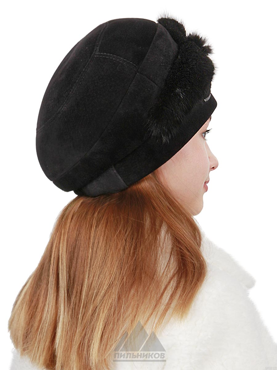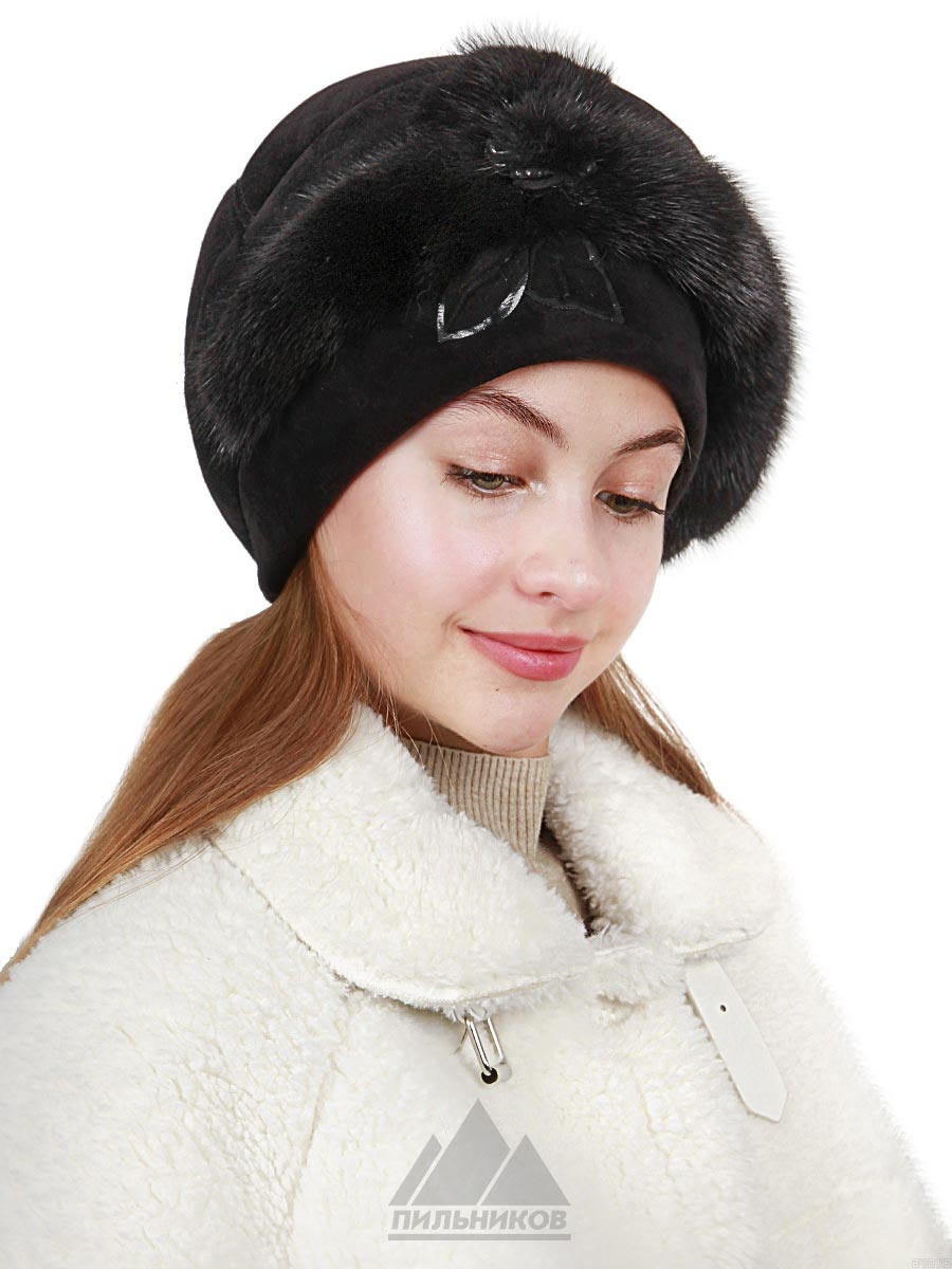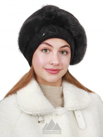 Берет «Калла» - женский головной убор из натуральной замши. Модель на небольшой ножке с отделкой из натурального меха норки. Сбоку головной убор украшен аппликацией из того же меха норки и замши. В нижнюю часть стойки втачана резинка. Внутри подкладка из флиса.